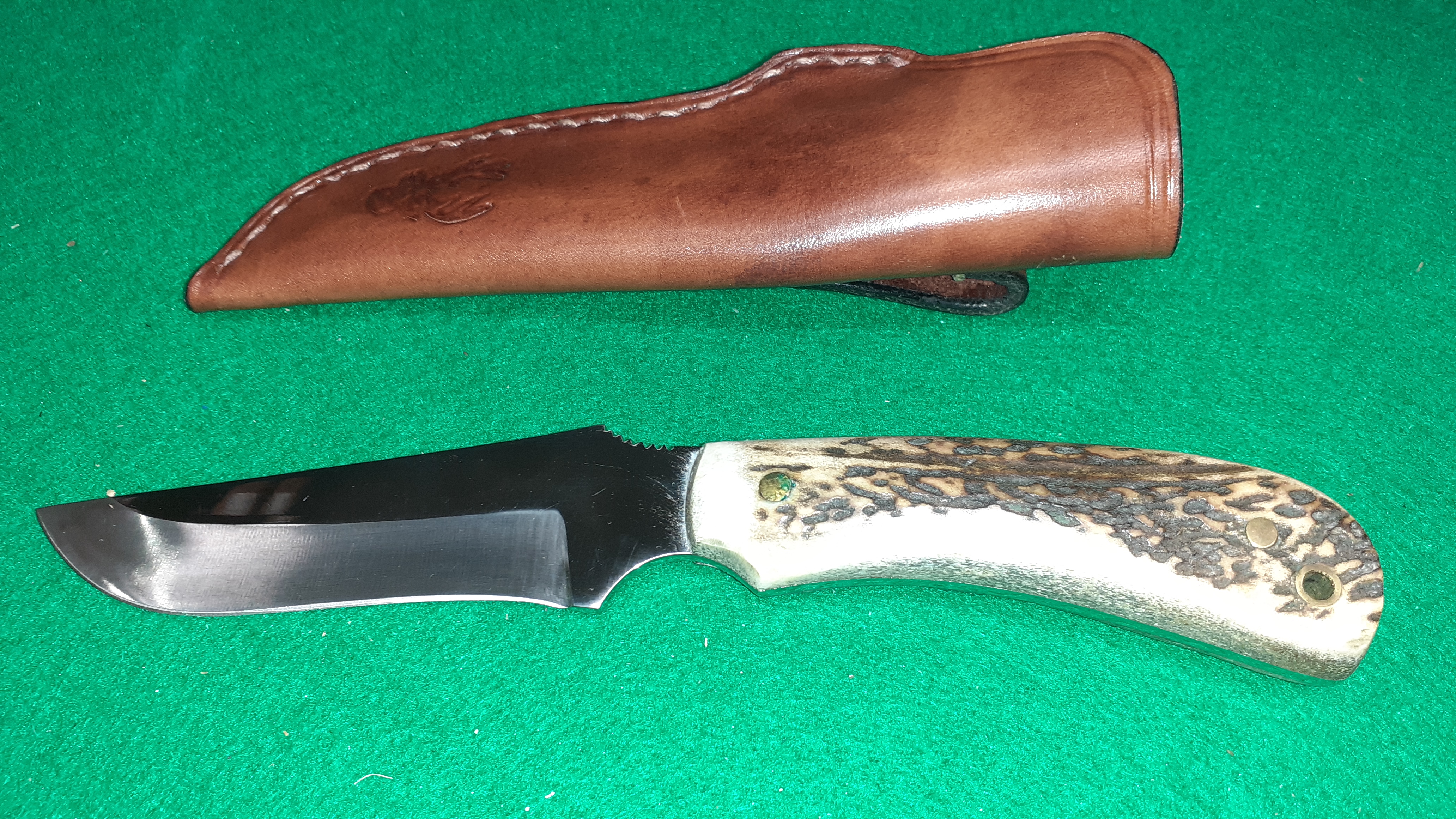 Lovecký nůž se střenkou z pravého parohu a signaturou BL. Délka čepele 100 mm.