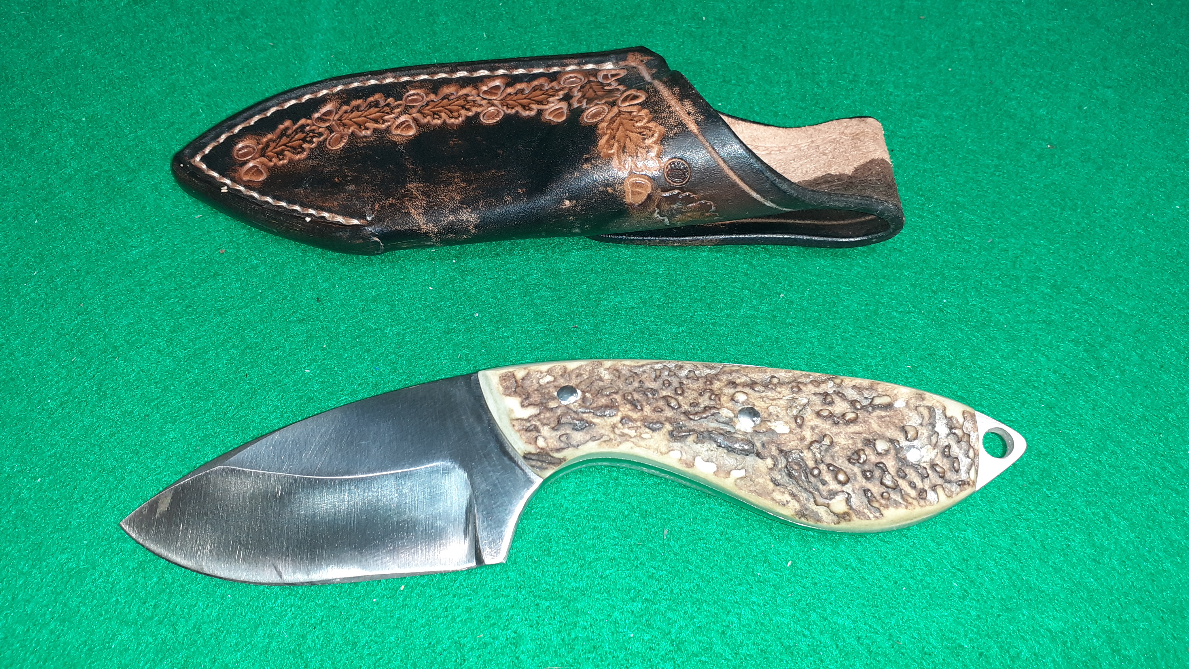 Praktický lovecký nůž se střenkami z pravého parohu. Délka čepele 85 mm.