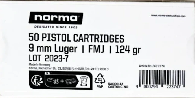 Náboje 9 LUGER FMJ NORMA 8gSkladem300 Kč/ ks248 Kč bez DPH