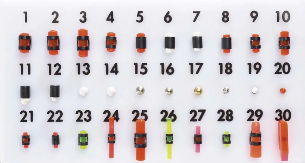 Světlovodné mušky italské firmy stilcrin se závitem 2,6 mm. Skladem jsou jenotlivě atikly 1-10, 23, 25, 30, 26 a set 29 obsahující 5ks kusů výměných vláken (bílá, oranžová, žlutá,modrá a zelená)